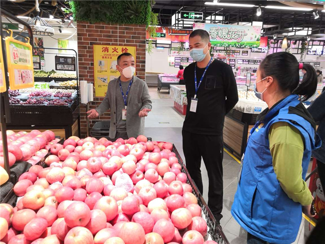 凌国发(中)在指导超市做好防疫期间日常用品食品的供应工作。