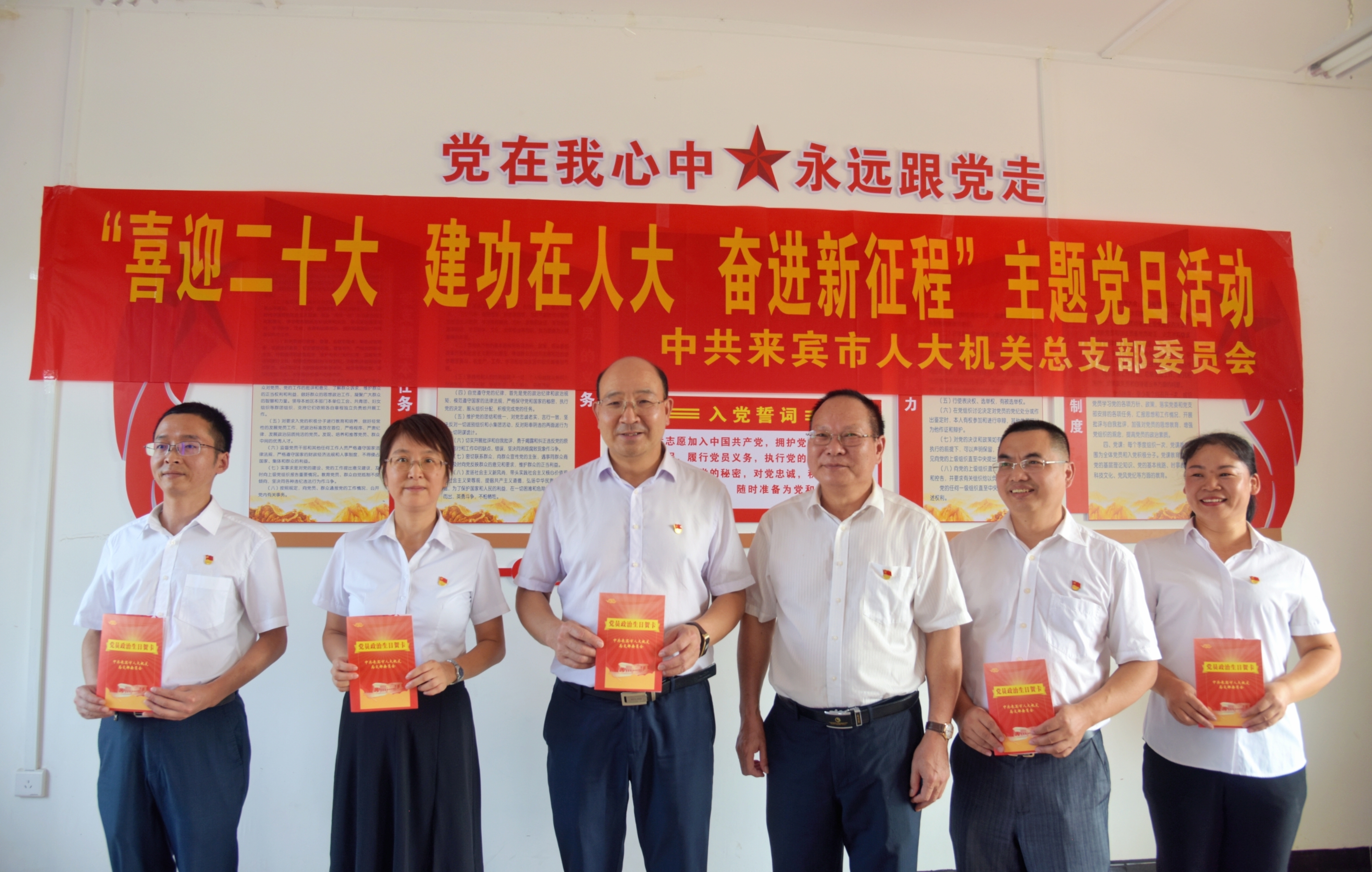 随后,党员集中在铁象村会议室同过政治生日。机关党总支部副书记韦兆坚为11名党员送上“政治生日”贺卡,并献上美好祝福。谢森林、韦正春、陈林等三位同志与大家分享“政治生日”感言,回顾入党心路历程和工作点滴感悟。他们表示,会始终牢记党员这个“第一身份”,坚定跟党走,常思“当初入党为什么、如今在党做什么、今后为党留什么”,始终牢记初心使命,增强思想意识,强化政治担当,立足岗位锐意进取,以强烈的紧迫感、责任感和使命感投入工作中,建功立业,用实际行动践行入党的誓言。