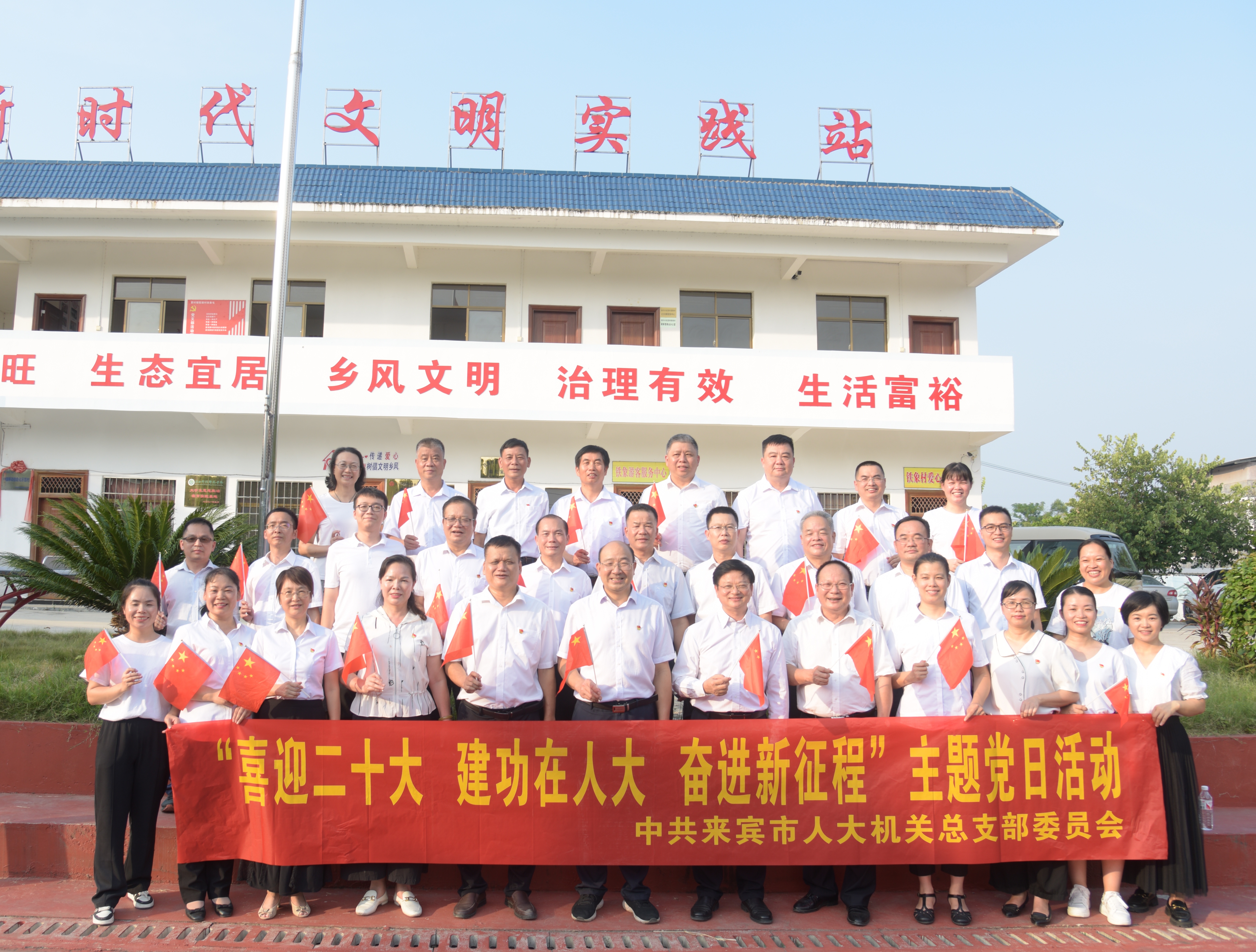9月27日下午,市人大机关党总支部到兴宾区蒙村镇铁象村开展“喜迎二十大 建功在人大 奋进新征程”主题党日活动。市人大常委会主任、党组书记韦平,自治区人大常委会委员庞标益,市人大常委会副主任吴孝斌以普通党员身份参加活动。