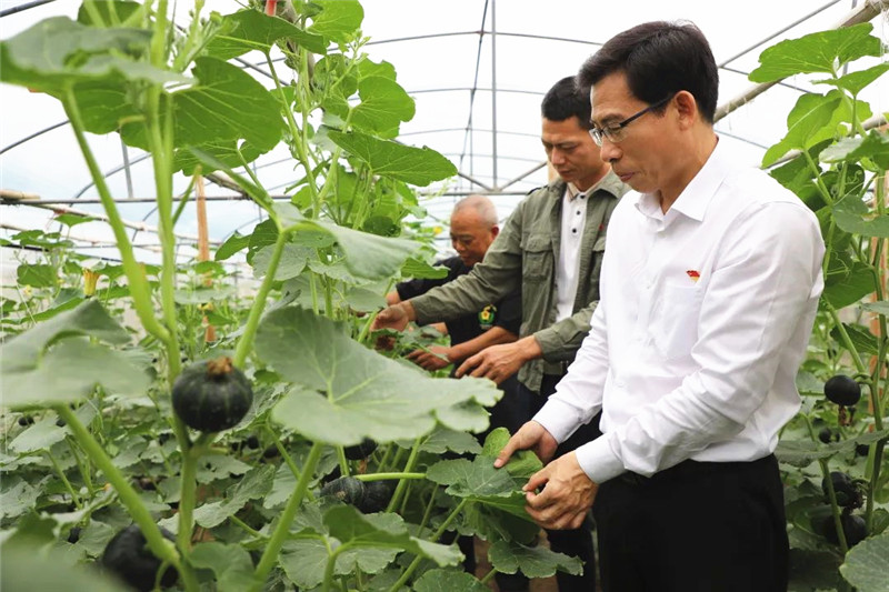 赵睿(前一)在瓜棚调研。